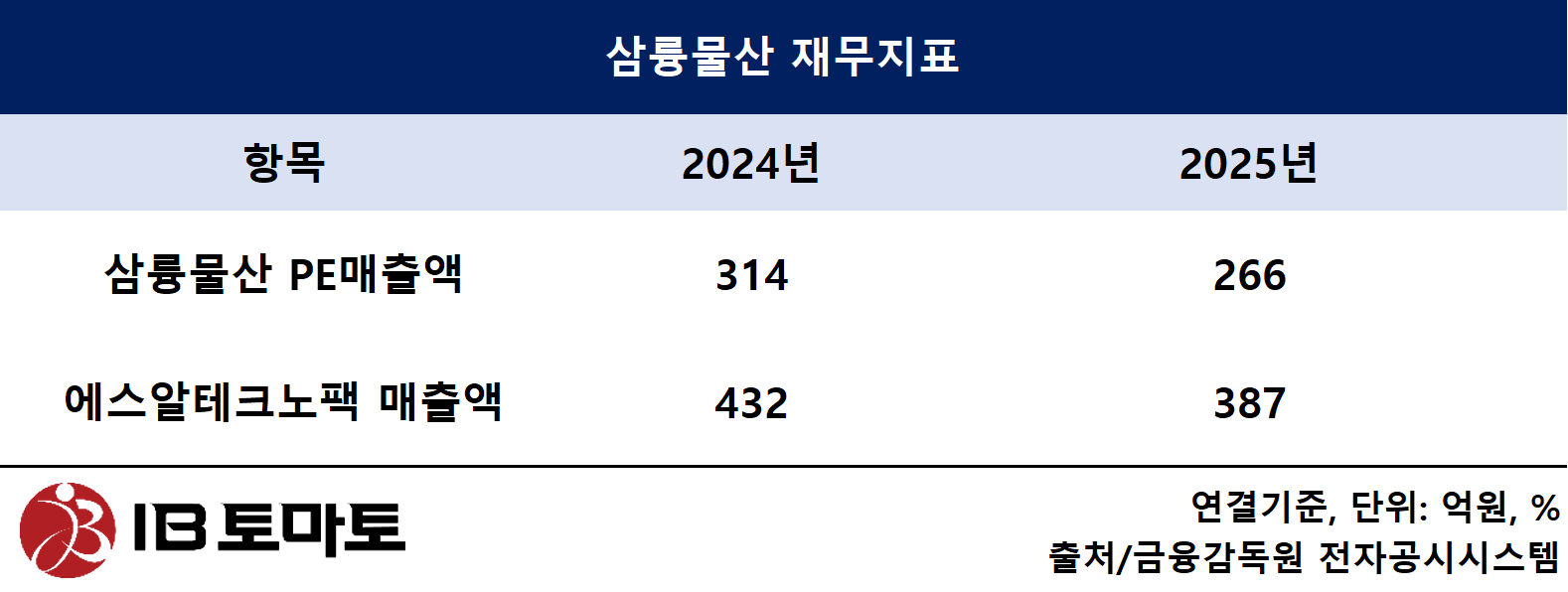 문제는 삼륭물산도 PE부문 매출액이 줄고 있다는 것이다. 자회사 에스알테크노팩과 매출처가 같아서다. 삼륭물산에서 PE부문 매출액은 지난해 266억원으로 전년 314억원 대비 15.3% 줄었다. PE부문 매출은 회사 전체 매출액의 약 28%를 차지한다. 자회사 외형 축소뿐만 아니라 그룹 전반의 수요 둔화로 이어진 모양새다.