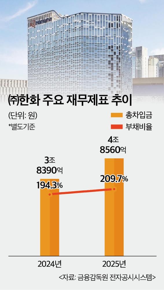 문제는 지주사인 한화 자체의 재무 여력이 빠르게 약화되고 있다는 점이다. 지난해 한화의 별도 기준 부채비율은 2024년 194.3%에서 지난해 209.7%까지 증가했다. 총차입금 또한 3조 8390억원에서 4조 8560억원으로 26.49% 늘었다.