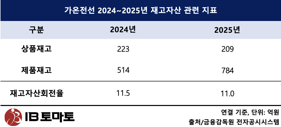특히 재고자산의 상품(209억원)과 제품(784억원)의 합(993억원)이 1천억원에 달한다는 점도 우려되는 지점이다. 2024년 말에는 상품(223억원)과 제품(514억원)의 합이 737억원에 그쳤지만, 지난해 들어 완제품 재고가 늘어나면서 팔리지 않은 제품이 늘어나고 있는 현실이 여실히 드러난 것이다.