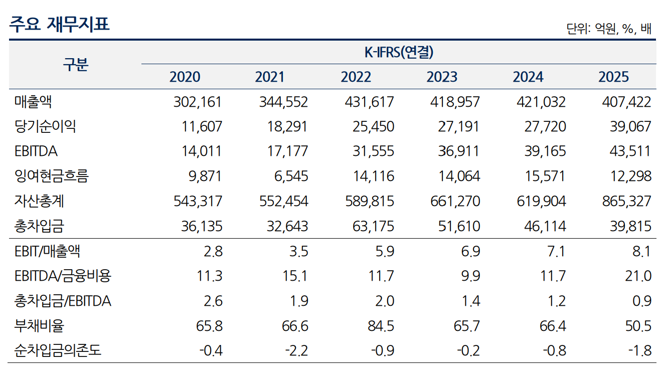 2025년 말 연결기준 회사의 총차입금은 리스부채를 포함해 총 3조 9815억원이며, 이 중 단기성차입금은 1조 8958억원으로 총차입금 대비 비중은 47.6%이다. 현금성자산은 5조 5268억원으로 단기성차입금을 큰 폭으로 상회하며, 우수한 잉여현금창출력이 유지되고 있어 원활한 만기 상환이 예상된다.